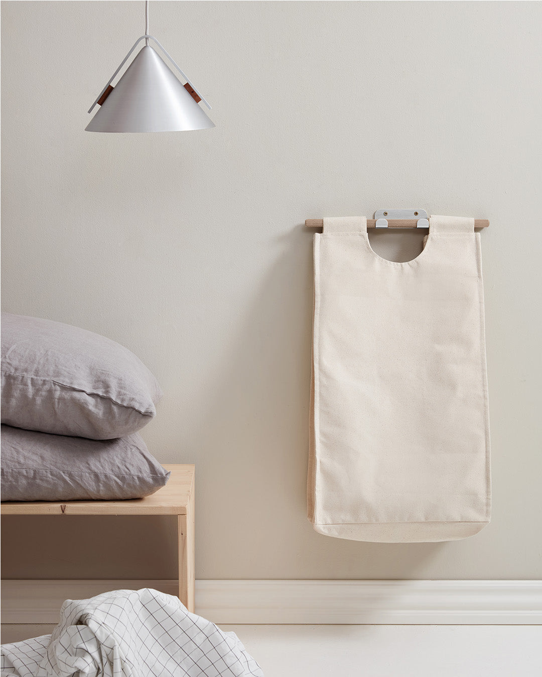 100% Cotton, PE coating, oak round sticks, and painted metal hook