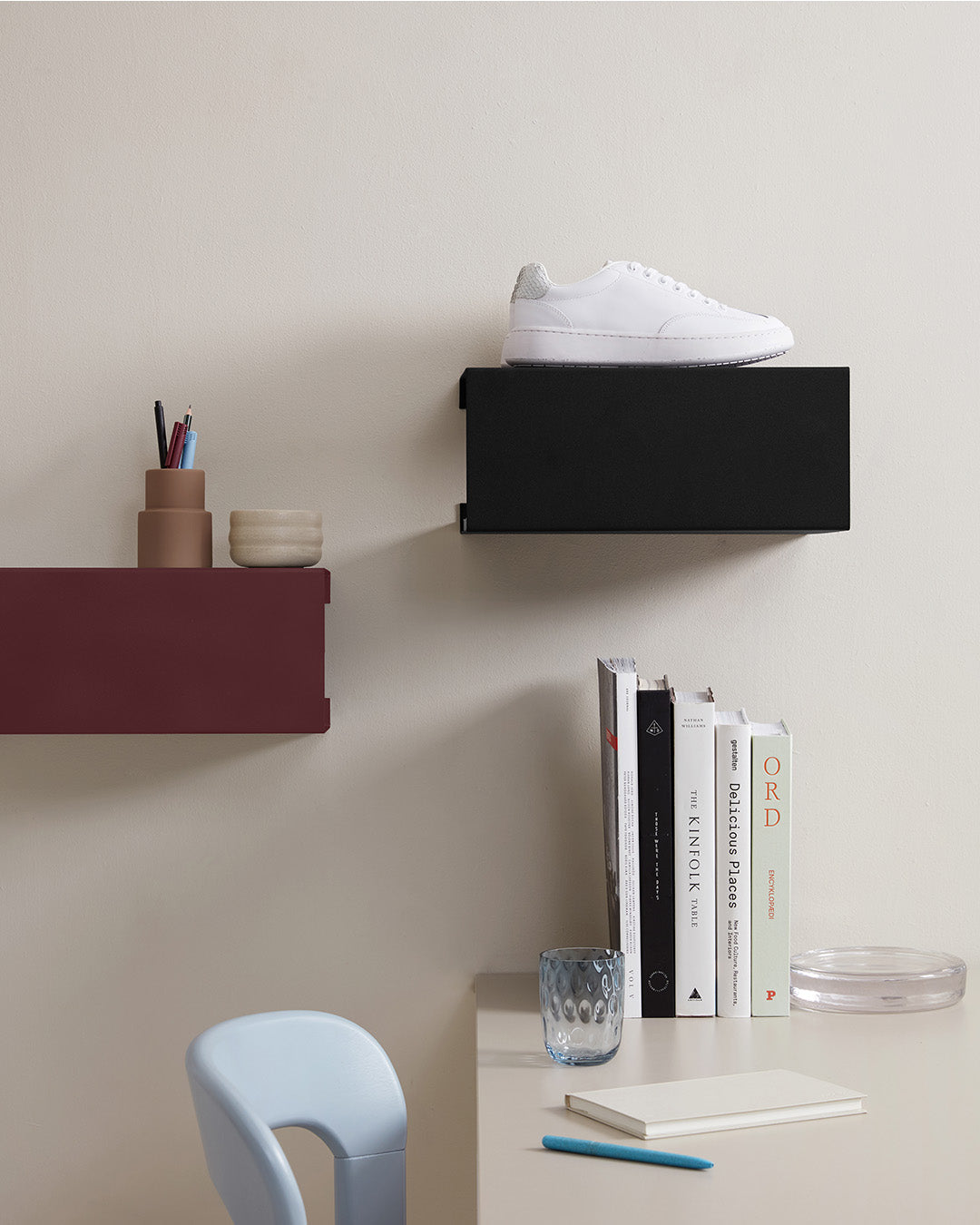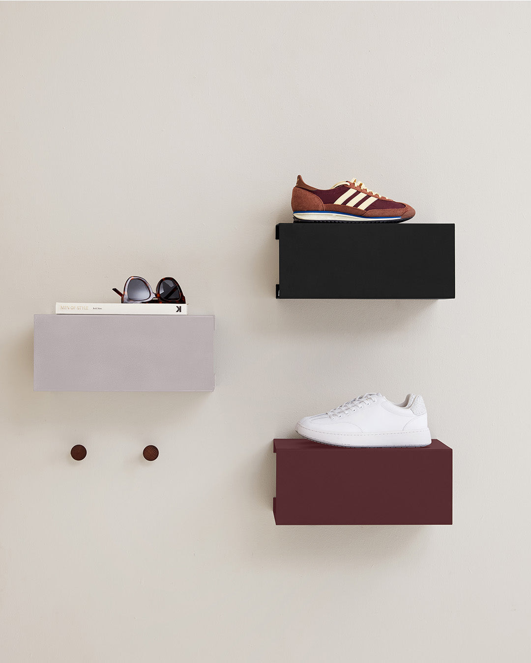 BoxShelf – A multifunctional and stylish storage solutionBoxShelf is made of metal with a beautiful, textured surface and comes in a wide range of lovely colors that fit perfectly into any interior. With BoxShelf, you can create your own personalized wall by combining shelves based on the number, colors, and style. It's the perfect solution for shoe storage – elegant, functional, and creative.But BoxShelf is more than just a shoe rack. Use it as a nightstand, with room for your book, alarm clock, and glasses. It also works perfectly in your entrance for storing keys, small items, or other essentials when you come home.BoxShelf is wall-mounted, making it both smart and space-saving. Its versatility and sleek design make it a must-have in any home where function and aesthetics go hand in hand.Material and DimensionsMaterial: SteelWidth: 35 cmDepth: 25 cmHeigh: 15cmThickness: 2 mmMaintenanceClean your BoxShelf with a soft, damp cloth or sponge. You may add a mild dishwashing detergent or soap if needed. Wipe it dry with a clean, dry cloth afterward.
