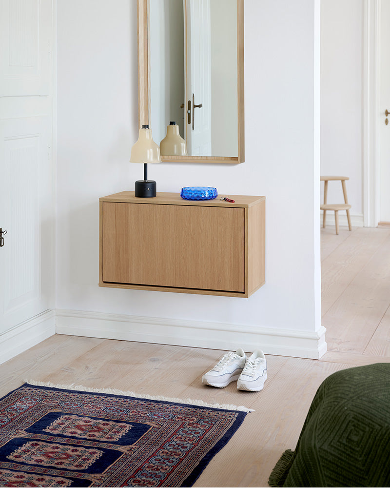 ReCollector Shoe Boxes – Create Your Own Storage Wall with StyleOur shoe boxes are the perfect solution for organizing your shoes in a stylish and efficient way. Available in five different versions – five beautiful colors and an oak veneer – each box can hold 6–8 pairs of shoes, giving you plenty of space for sneakers, boots, and elegant shoes.The shoe box is ideal for an inviting entrance, a well-organized wardrobe, or a utility room with structure and order. Its simple and classic design allows the box to blend seamlessly with your personal décor, while adding natural elegance, order, and functionality to your home.The box is wall-mounted, meaning it won’t take up floor space and ensures easy cleaning. You can stack the boxes on top of each other, place them side by side, or arrange them in any way that suits your style and home. Combine them with our other storage boxes, which share the same design and color universe, and create a personalized storage wall that reflects your taste.The shoe box opens easily with a push-lock, so you can quickly access your shoes when you need them. It is assembled and designed to last for years, ensuring your shoes are well-protected. You can also use the top surface for additional storage or decorative items.Our shoe boxes are produced in Denmark from FSC-certified wood.In short, ReCollector’s shoe box is the perfect way to organize your shoes in a practical and simple way, while adding a beautiful and elegant detail to your home.Materials and DimensionsFSC-certified woodWidth: 70 cmHeight: 40 cmDepth: 30 cmWeight: 12.5 kgColor gloss: 30Note: We have chosen to flatpack our shoe box to optimize transportation and reduce the risk of transport damage, which ultimately lowers our CO2 footprint. Therefore, the box is delivered unassembled, but with our detailed guide, it is easy and straightforward to assemble and mount.MaintenanceThe Shoe Box can be cleaned with a soft, damp cloth or sponge. If necessary, you can add a mild dish soap or regular soap. Wipe with a clean, dry cloth.Let me know if you need any further adjustments!